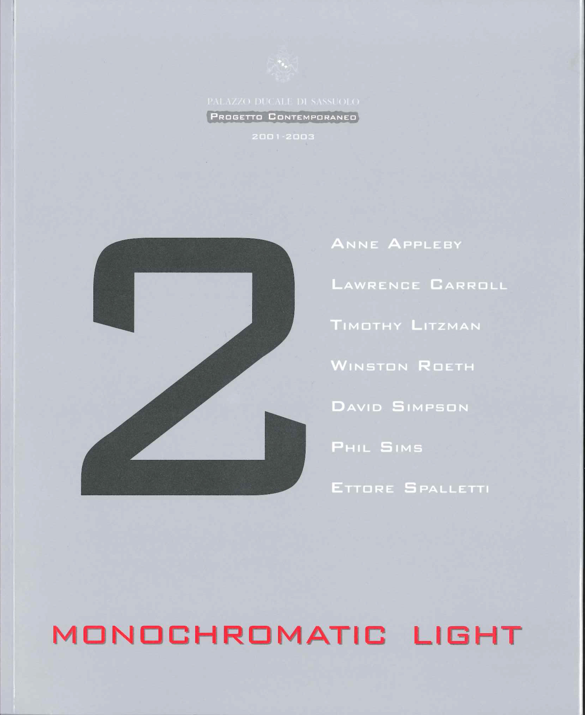 Filippo Trevisani (ed.), Monochromatic light. Artisti americani ed europei dalla Collezione Panza, Palazzo Ducale, Sassuolo, September 2001 - September 2006, Il Bulino edizioni d’arte, Modena 2002 (bilingual edition Italian and English).